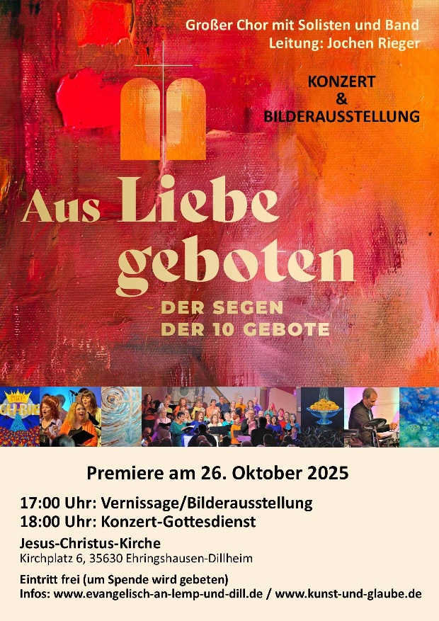 Wir laden ganz herzlich für den 26. Oktober 2025 in die Kirche nach Dillheim ein. Im Rahmen der Predigtreihe „Die 10 Gebote“ findet ein Konzert mit dem LDWG-Chor unter der Leitung von Jochen Rieger statt. Dazu werden Bilder zum Thema ausgestellt.